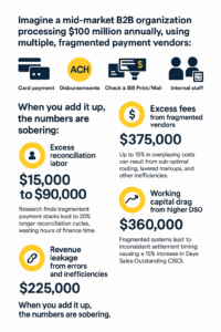 Imagine a mid-market B2B organization processing $100 million annually. They use one vendor for card payments, another for ACH, a third for disbursements, a fourth for check printing and mailing, and internal staff to reconcile it all.